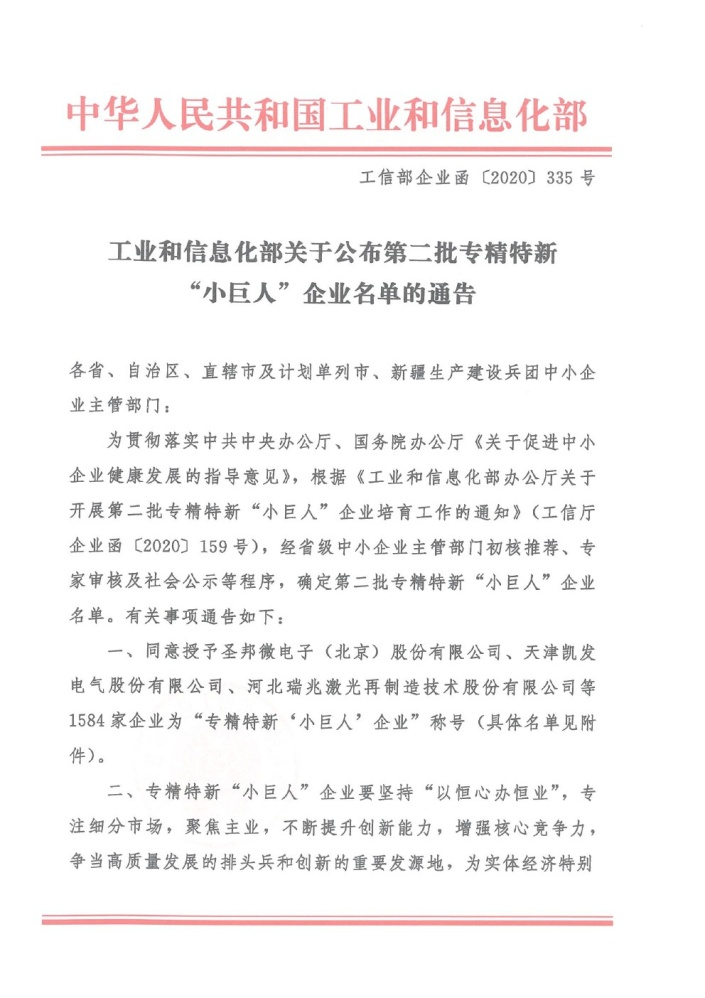 2020年12月11日,我公司被國(guó)家工業(yè)和信息化部認(rèn)定為第二批專(zhuān)精特新“小巨人”企業(yè)。